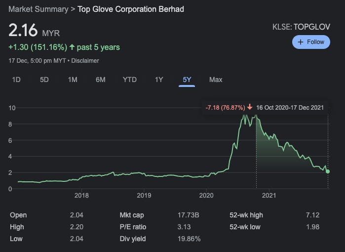 One funny observation that can be made is that the founder of Top Glove (7113.KL) - Lim Wee Chai (currently the 8th richest man in Malaysia) - also owns about 4% of SEM’s outstanding shares, for some reason. You may have heard of Top Glove (the world’s largest glove manufacturer) when it made headlines last year as one of the biggest beneficiaries of the COVID-19 pandemic; and subsequently became one of this year’s worst performers amidst the pandemic’s gradual recovery: