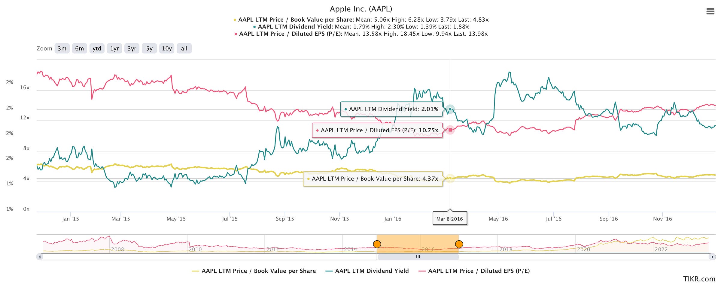 Answer: AAPL was already trading at below 15x earnings in 1Q16, and even consensus at the time agreed that its earnings would still post positive growth going forward (albeit slightly muted). It was highly likely then that AAPL would remain at >15x earnings within the next 12 months (i.e. 1Q17).