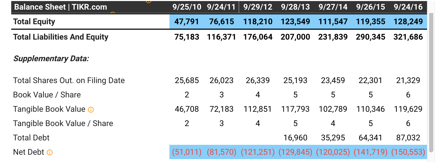 AAPLâs Net Cash position was higher than its Total Equity by FY15 â which meant that it could theoretically recreate KOâs negative Total Equity balance via share buybacks overnight. (Figure 1 below)