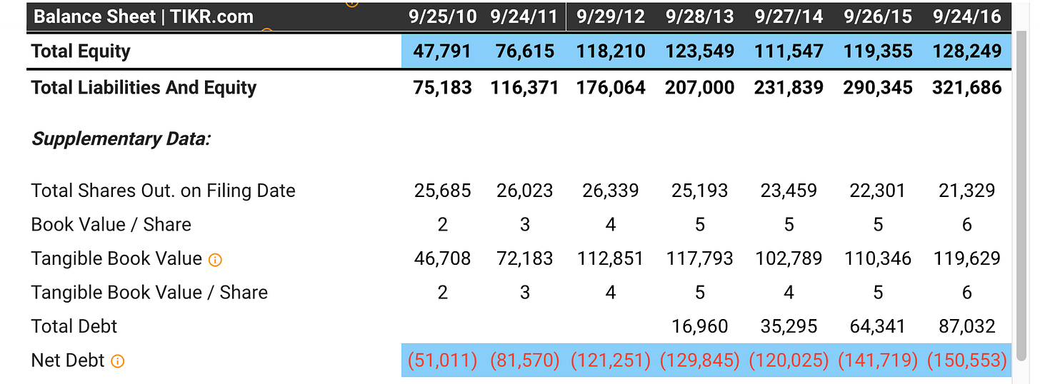 By 2016, AAPL was already showing signs of prioritizing shareholder returns, via taking on debt and channeling its practically unlimited FCF towards dividends & share buybacks (of its undervalued stock) â alĂĄ The Outsider CEOs: