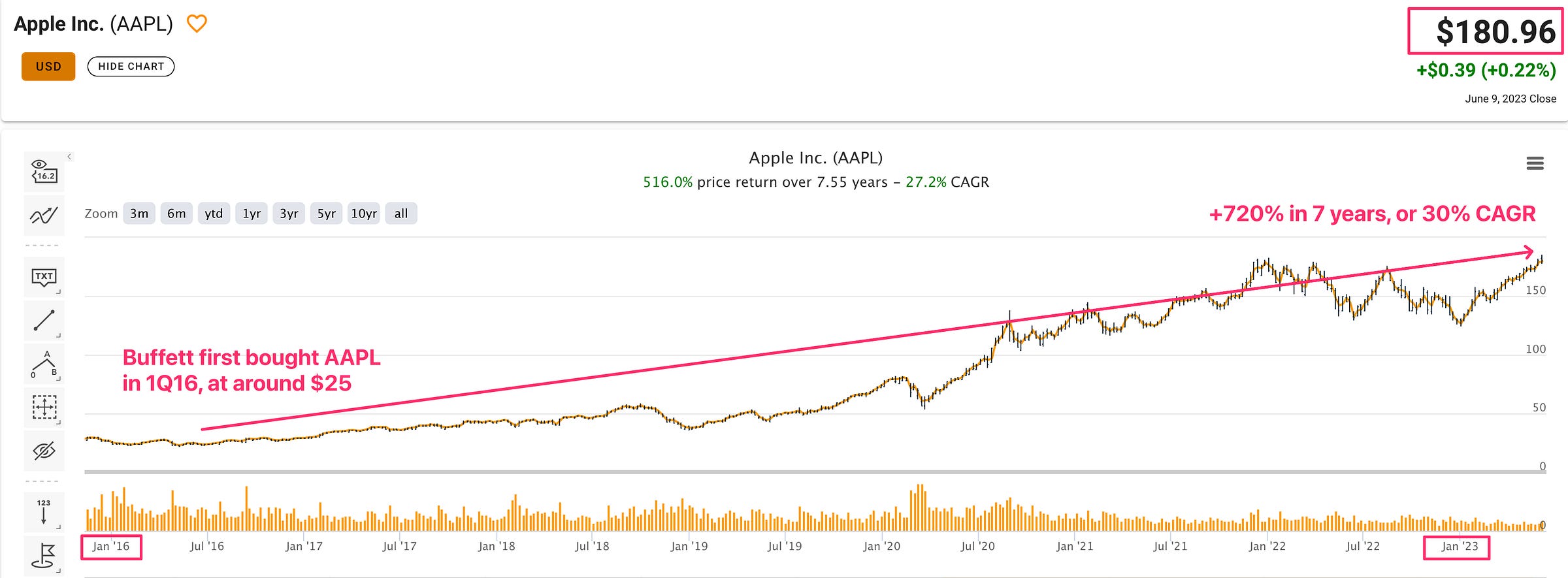 But wait, thereâs more! Thereâs a notable elephant in the room here â none of the investment requirements above imply that Buffett had bought AAPL 0.00%â knowing in advance that it could clear +30% CAGR over the next 7 years! In contrast to the popular narrative, it seems far more likely that he had made his investment decision into AAPL thinking that there was simply no way he could possibly lose money on it â and he was perfectly fine with the 10% yield or whatever that he could get out of it. If true, this would align magnificently with Ben Grahamâs following quote: