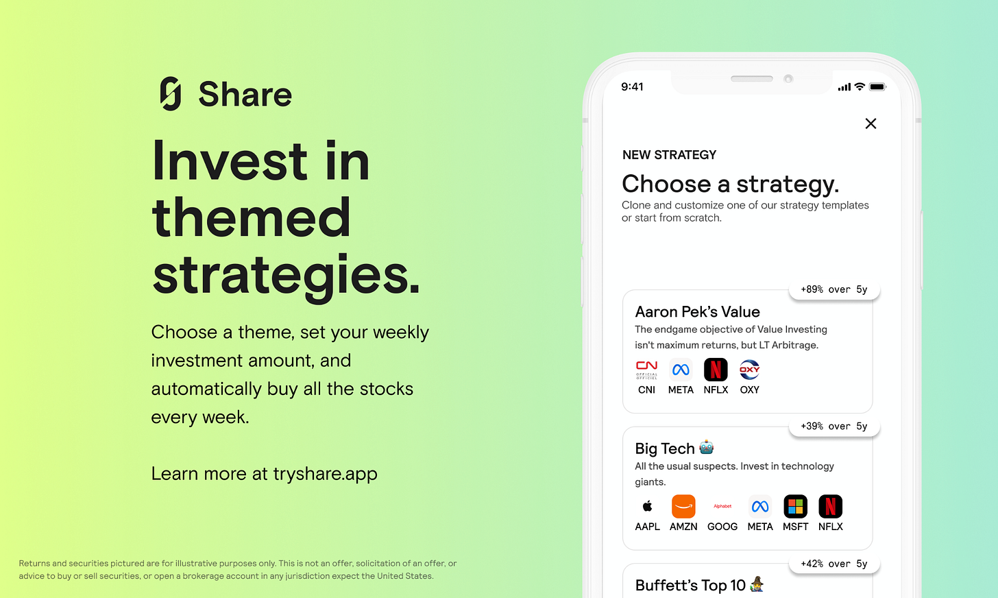 Share is built for long term investors. Create your own ETF, or invest in one of our premade strategies.Â