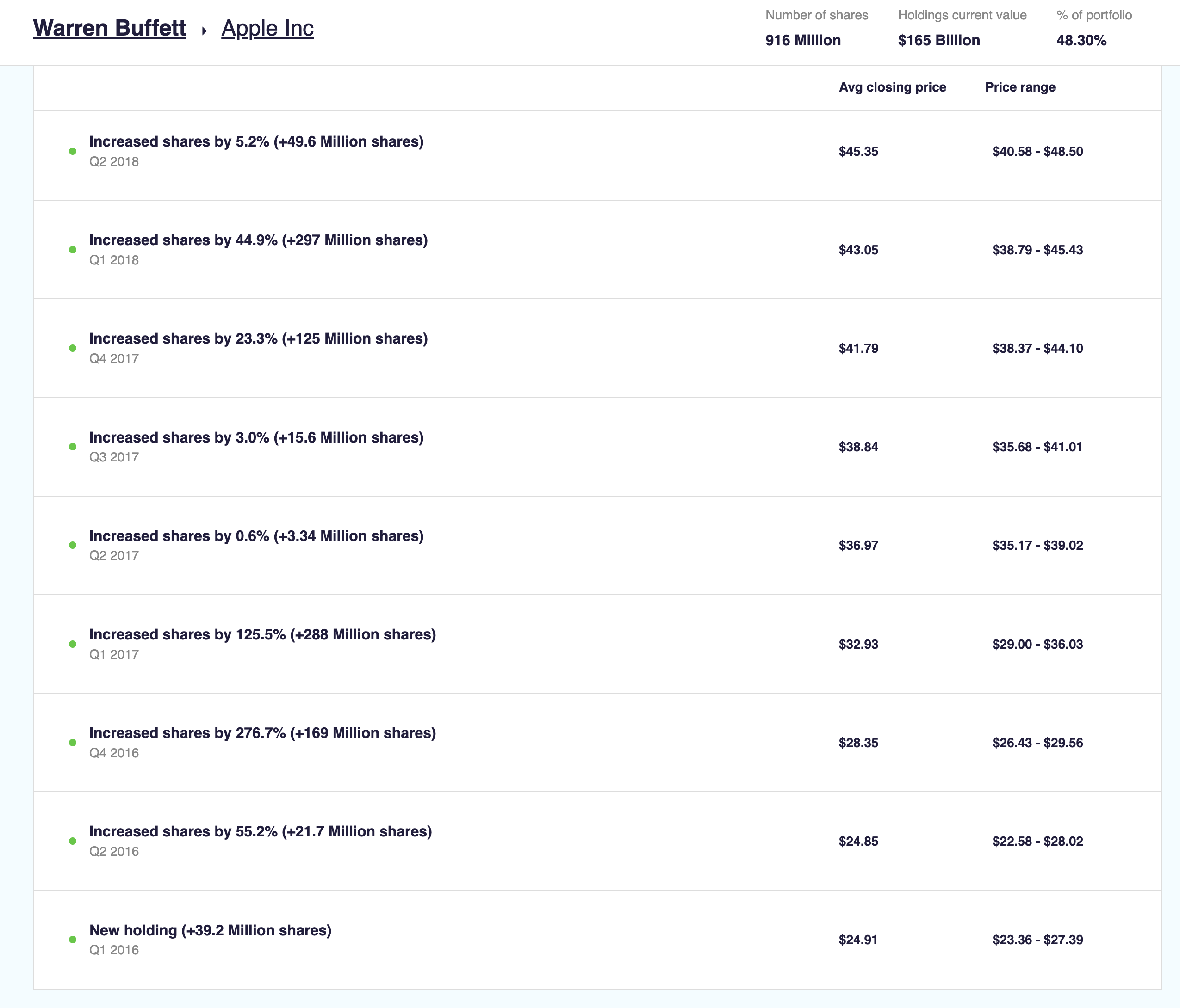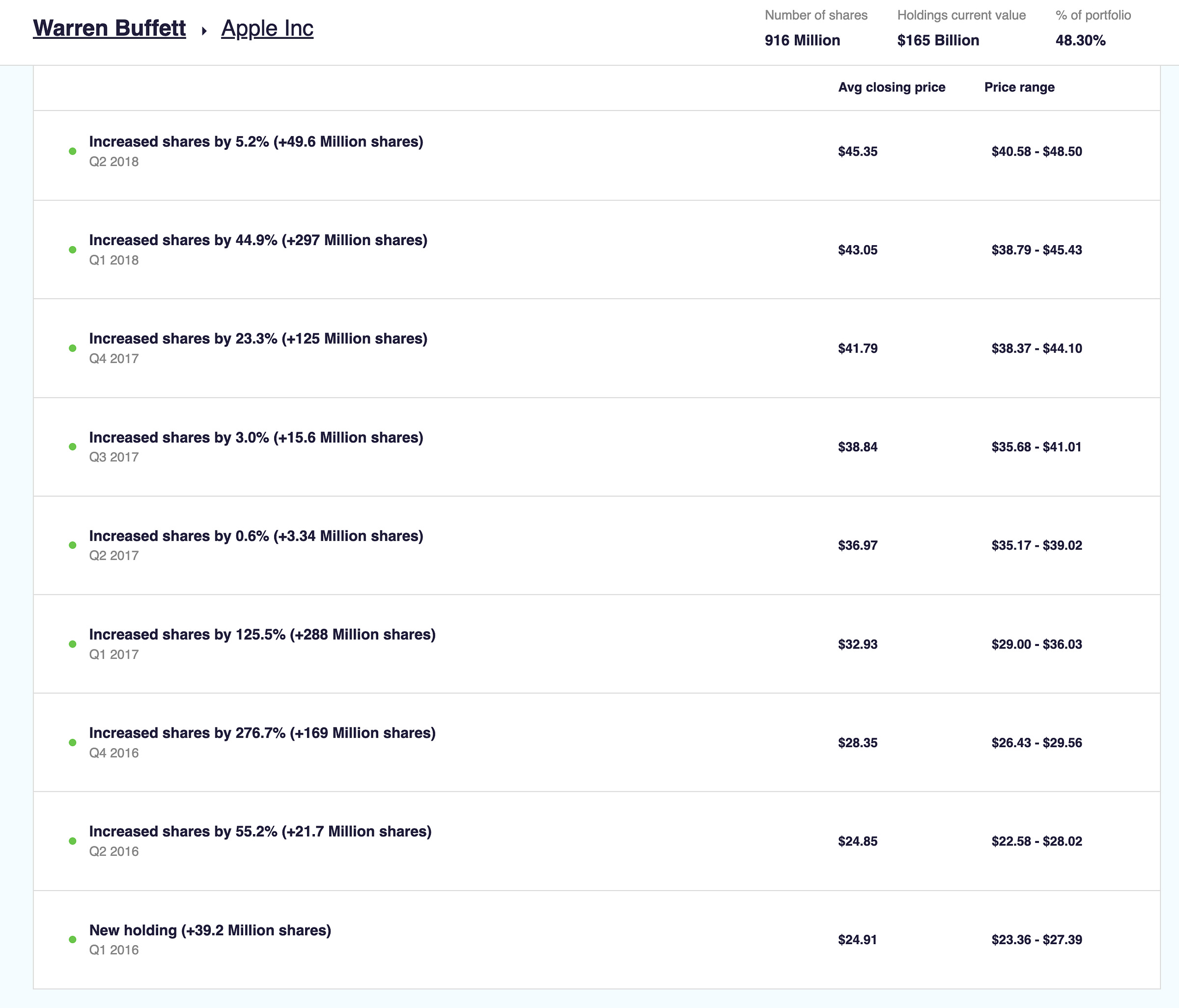 As shown in the chart above, Buffett acquired his first AAPL 0.00%â stake in 1Q16. Much like his OXY purchases today, his early AAPL purchases were large & gaping â like a hungry toddler. We can see how by 4Q16, Berkshire was entertaining stock purchases of 100-200 million shares per quarter.