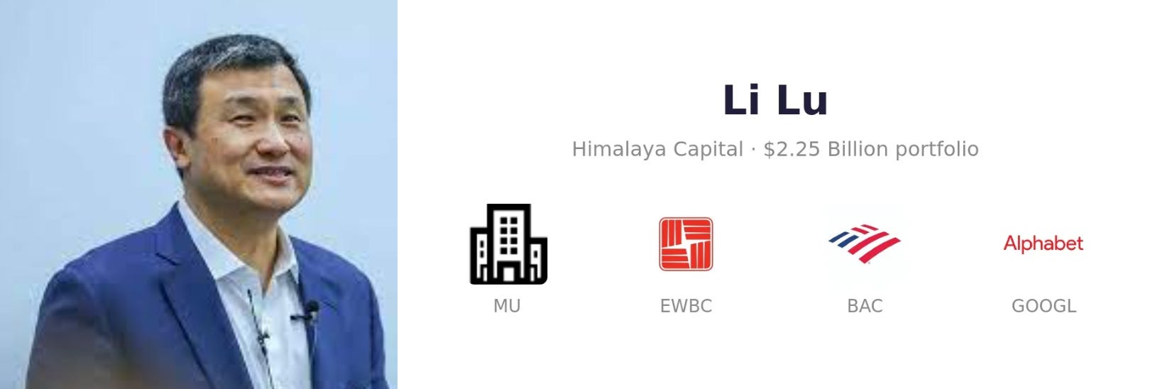Li Lu’s 6th Largest Position — Himalaya Capital Management’s latest 13F filing (Mar 31) showed that it entered a new position in EWBC 0.00%↑. Li Lu invested in about 2.3 million shares of EWBC, allocating 5.5% of the firm’s equity portfolio to the stake and making it his 6th largest stake. Li Lu’s average entry price was around $69 — the current stock price is $54, ~20% below Li Lu’s entry price.