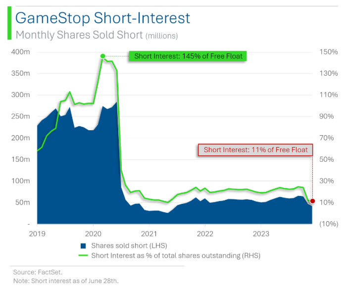 Nor is it the same stock that it was in 2021, where a confluence of market factors came together to effect the now infamous “gamma squeeze”. At the time, total short interest represented a 4th-wall breaking 145% of its free float, which enabled covering shorts to send its stock price to stratospheric heights. In contrast, GME’s total short interest today is only 11% of its free float — even lower than its historical average of roughly 20%.