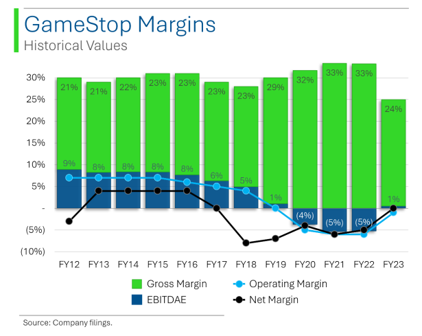 Gamestop’s Operating Margins substantially represent all of their Net Margins;
