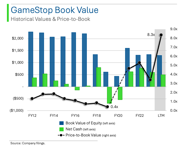 Hence, we can conclusively say that GME is not the same stock as it was in 2019, when Michael Burry first announced his GME position. As the chart above shows, it was trading at a mere 0.4x P/B at the time vs. 8.9x today. Dr. Burry, this ain’t.