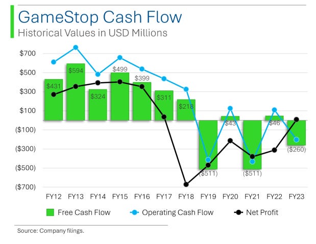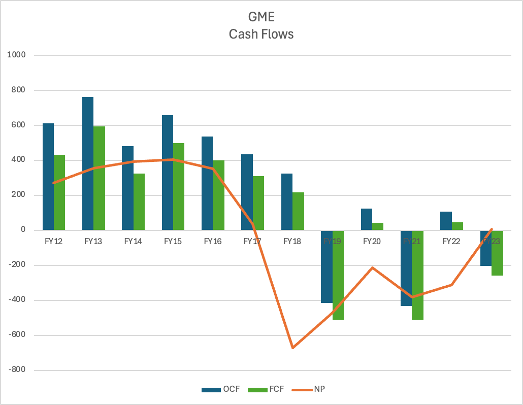 This narrative can be confirmed by observing their historical cash flows. We can see from the chart above how GME’s Net Profit, OCF and FCF have more or less been in negative territory since FY19. This is pretty much the nail in the coffin for the “GME’s valuations are based on fundamentals” argument.
