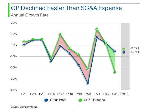 The chart below proves this — Gross Profits have fallen by -6.3% CAGR since FY13 (blue dot, rightmost), while SG&A expenses have only fallen by half of that or -3.3% CAGR (green dot, rightmost) over the same period: