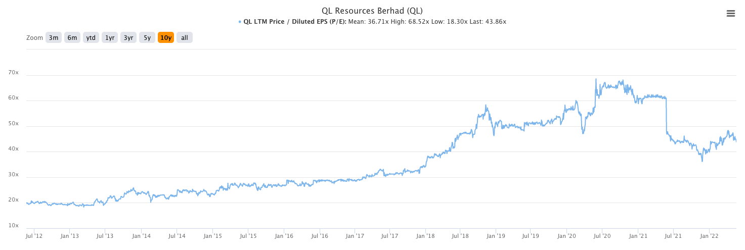In Malaysia specifically, the listed company QL Resources (QL) introduced the Japanese convenience store chain FamilyMart to the local masses with riproaring success - QL has been trading at an average PE ratio of approximately 50x since they brought FamilyMart onto local shores around 2017, as shown in the chart below: